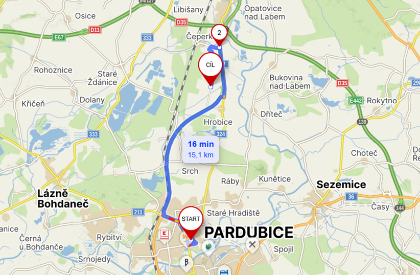 Poznámka: Vzhledem k probíhající rekonstrukci kanalizace pod silnicí Hrobice – Úpravna vody doporučujeme příjezd ze strany od obce Čeperka.